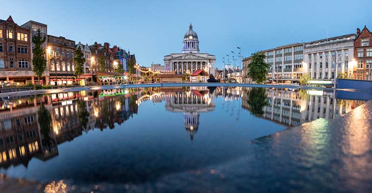 Located in central England just off the M1 and with excellent rail connections, Nottingham is a thriving city with plenty of shopping and entertainment opportunities for visitors. For residents, decent employment rates coupled with affordable house prices make Nottingham a viable place to work and live – it’s also entirely feasible to live in Nottingham (taking advantages of the lower cost of living) and commute to London direct by train.